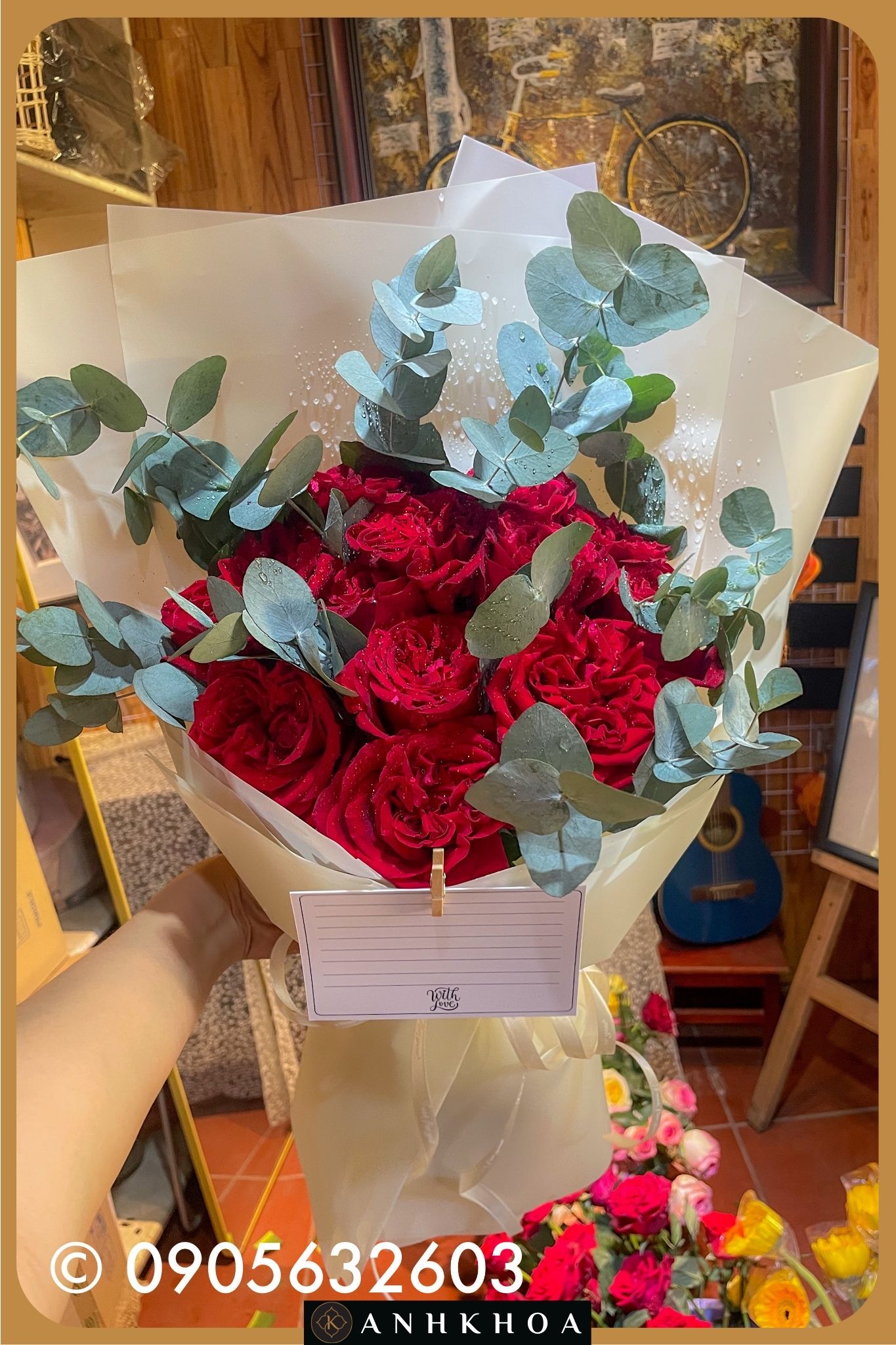 This stunning bouquet features a lush arrangement of deep red roses, beautifully accented with fresh eucalyptus leaves. The roses are rich in color and full in bloom, symbolizing deep love and heartfelt celebration. This bouquet makes a perfect birthday gift or romantic gesture.