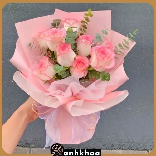 The bouquet is a charming arrangement of soft pink roses, blended with sprigs of eucalyptus for a touch of greenery. The delicate flowers are nicely wrapped in layers of pale pink paper, adding a sweet and elegant appearance. The finishing touch is a translucent ribbon tied at the base, which highlights the softness and romance of the arrangement — perfect for a birthday, anniversary, or a loving surprise.