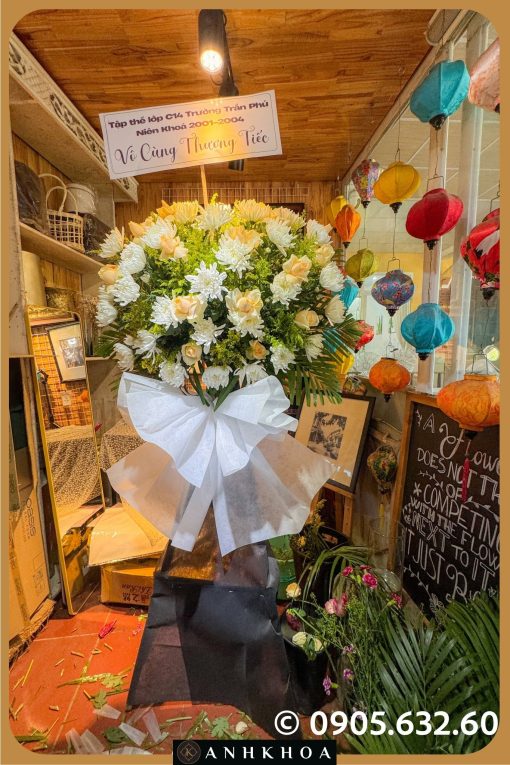 Shop bán hoa chia buồn Anh Khoa Flowers chúng tôi đảm bảo cây hoa chia buồn mà đặt tại cửa hàng chúng tôi sẽ luôn đặc biệt, tươi trong 3 ngày. Thiết kế hoa nhanh trong vòng 45 phút kể từ khi quý khách chốt đơn hoa tươi.