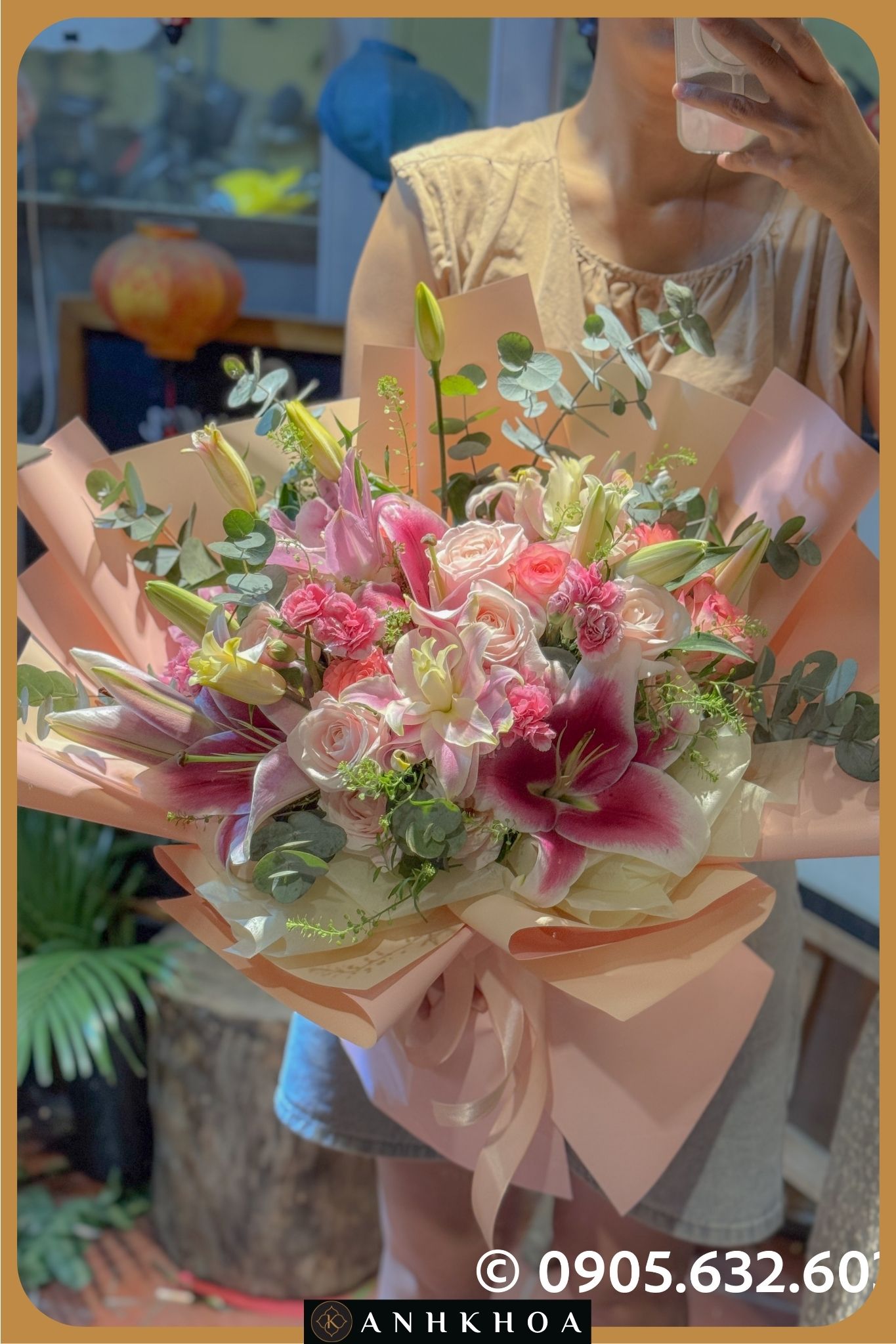 This bouquet is a stunning arrangement full of charm and elegance. It features a harmonious blend of soft pink lilies, pastel roses, and deep magenta stargazer lilies, beautifully accented with white lilies, carnations, eucalyptus leaves, and delicate filler flowers. Wrapped in layers of peach and cream-toned paper with a soft satin ribbon, the bouquet exudes romance and grace — perfect for expressing deep love, heartfelt congratulations, or simply brightening someone’s day.