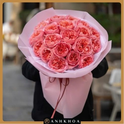 This elegant bouquet features a beautiful arrangement of peach-pink garden roses, carefully gathered to create a full and luxurious look. Each bloom has soft, layered petals that form a delicate rosette shape, adding depth and romantic charm to the bouquet. The flowers are wrapped in pastel pink paper and finished with a matching ribbon, creating a sweet and graceful presentation. This bouquet is perfect for birthdays, anniversaries, Women’s Day, or any special moment when you want to express love and admiration.