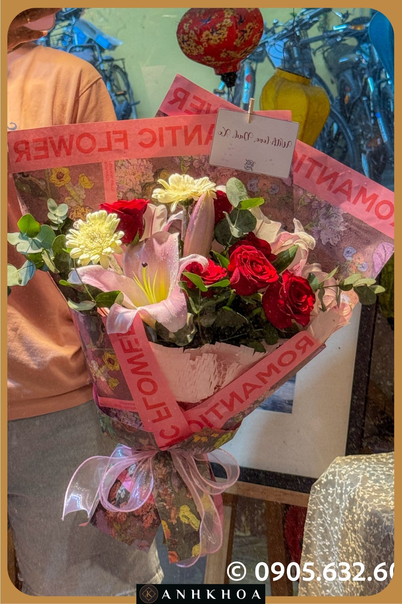 2 pink lilies – symbolizing admiration and sweetness, 2 white gerbera daisies – representing purity and cheerfulness, 6 red roses – the classic symbol of passionate love. Along with eucalyptus and filler greens to add freshness and texture. Wrapped in floral-patterned paper with bold pink “Romantic Flower” accents and tied with a soft organza ribbon, this bouquet beautifully balances elegance and heartfelt emotion — perfect for love declarations, special anniversaries, or simply brightening someone’s day.